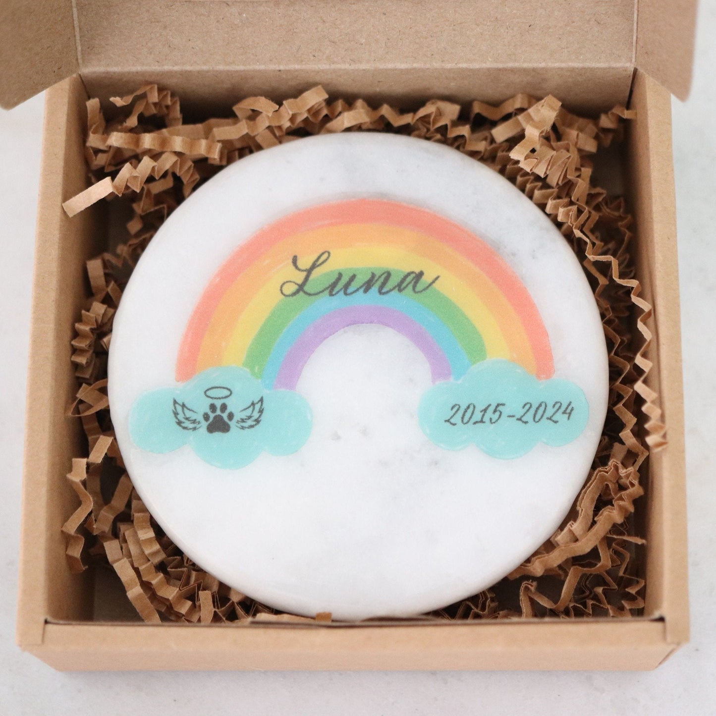 Pet memorial stone or dog name marble rock is a custom sympathy gift for people who loss a pet, pet lover, gardener or others . This beautiful memorial stone is an amazing idea to keep your loved ones close, always. The marble stone comes in a gift box and stone art includes: a rainbow bridge, custom name, and custom date.
