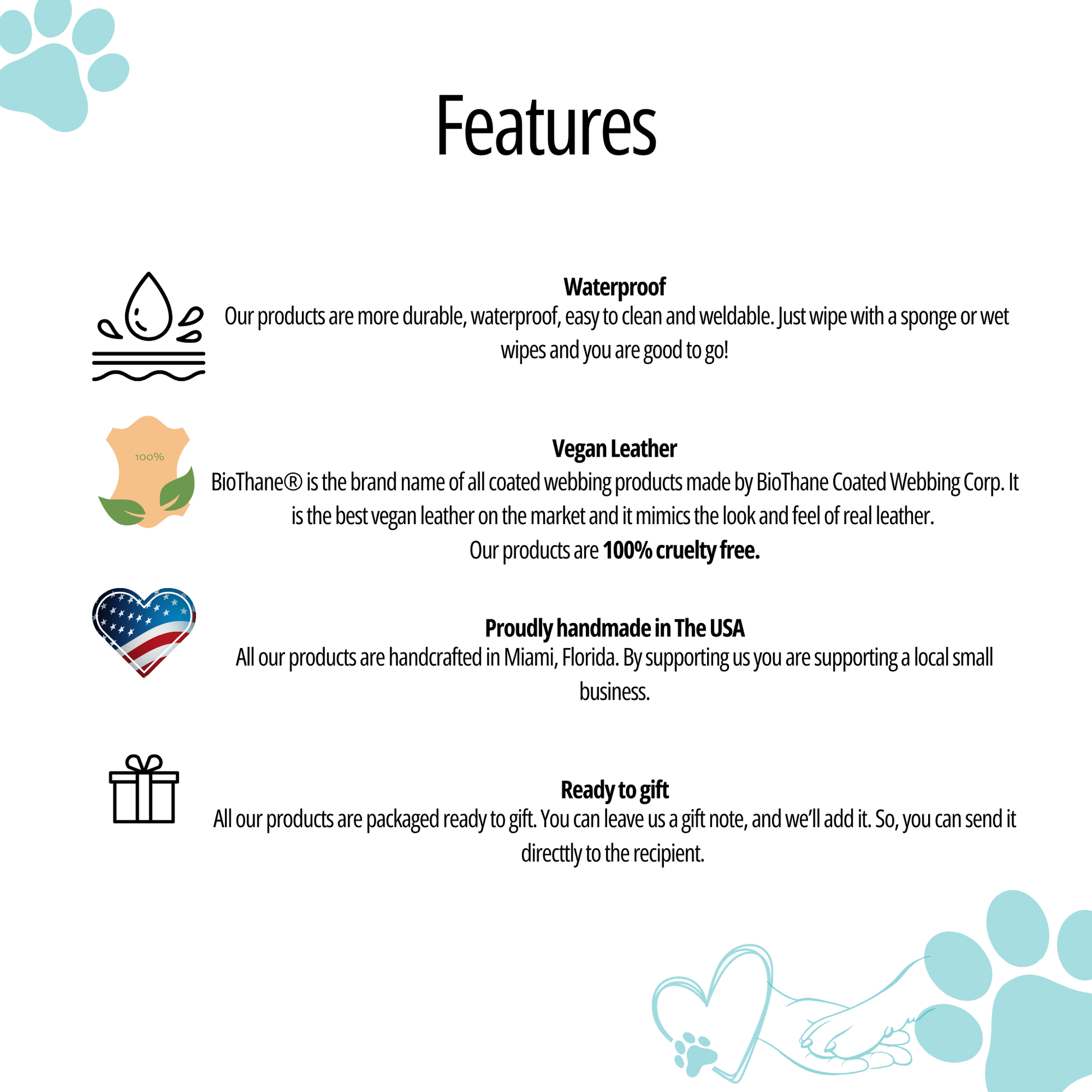 This premium Biothane® material is a durable and eco-friendly alternative to leather, this collar combines the luxurious look of leather with the ethical peace of mind that comes from a vegan product. Each collar is custom-made to fit your pup perfectly, ensuring comfort and style go paw-in-hand. This collar is designed for long-lasting wear and easy maintenance.